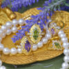 Ornate open ring blending gold, olive and purple zirconia in Renaissance-inspired filigree setting.