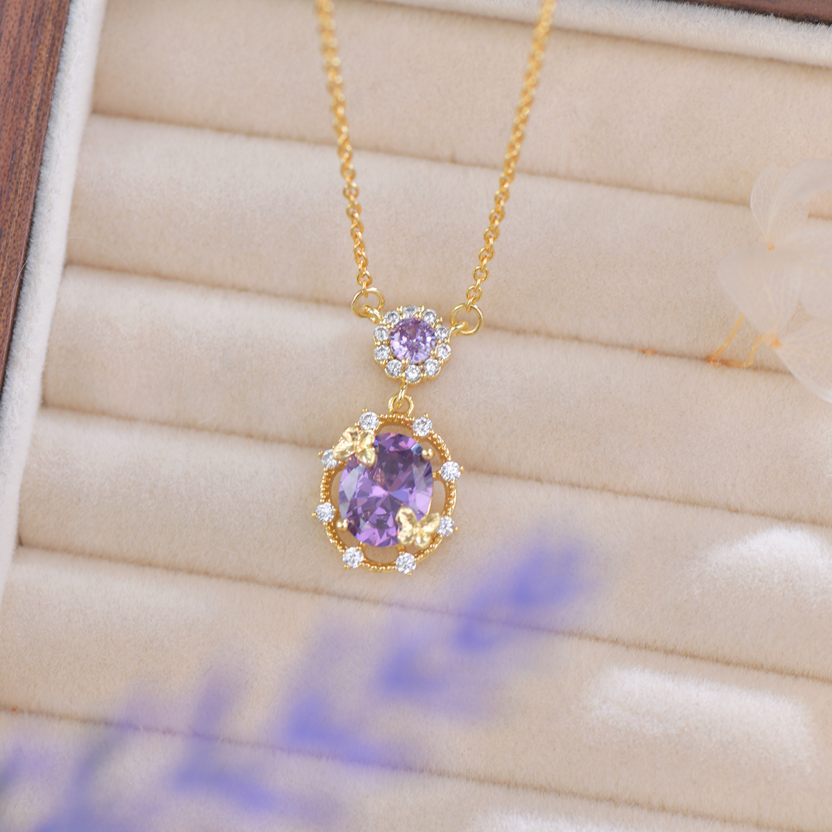 Exclusive patented butterfly-themed jewelry set featuring premium purple zirconia, including a delicate necklace, bracelet, and earrings with French-inspired luxury details.