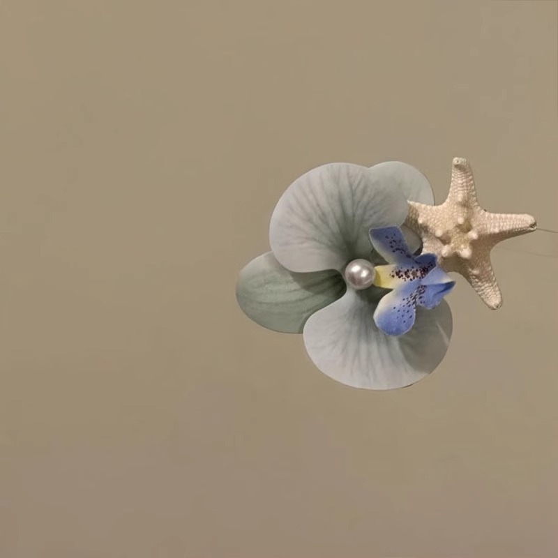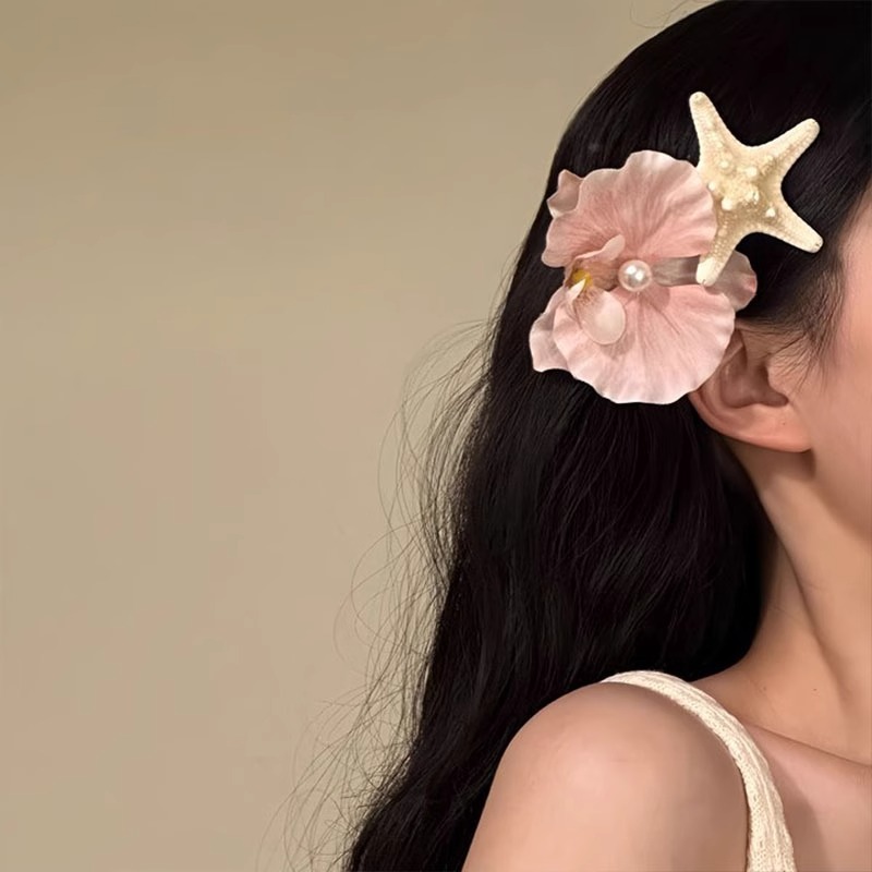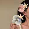 Coordinated orchid and starfish clips for beachy hairstyles, adding whimsy to braids or half-up styles.